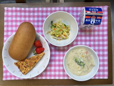 パン、オムレツ、コーンサラダ、ホワイトシチュー、いちご、牛乳
