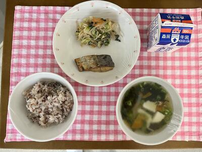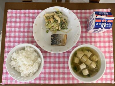 ごはん、鯖の香味焼き、キャベツともやしの胡麻和え、沢煮椀、牛乳