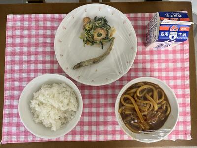 ごはん、ししゃもの天ぷら(5,6年生は2尾)、水菜の胡麻和え、味噌煮込みうどん、牛乳
