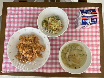 チキンライス(1,6年生オムライス)、マカロニカレーサラダ、ひよこ豆のスープ、牛乳