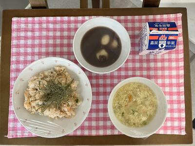 鮭ずし、むらくも汁、白玉ぜんざい、牛乳