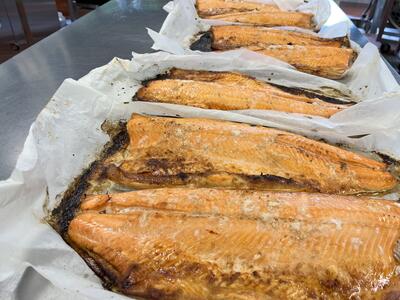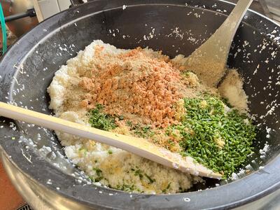 鮭ずしは、鮭のフィレを給食室で焼き、身をほぐして酢飯と混ぜ合わせてます。