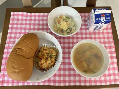 パンプキンパン、マカロニグラタン、ハワイアンサラダ、ベーコンスープ、牛乳
