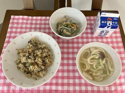 ひじきごはん、だいこんとちりめんじゃこのあえもの、ごもくうどん、牛乳