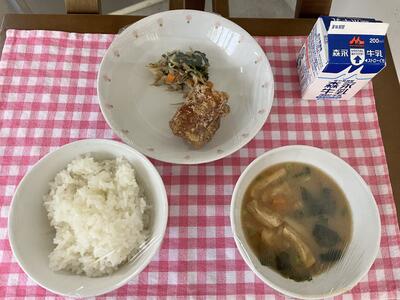 ごはん、とりのからあげ、きのこあえ、みそしる、牛乳