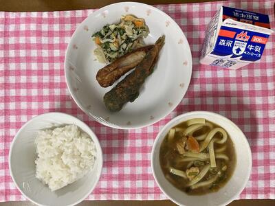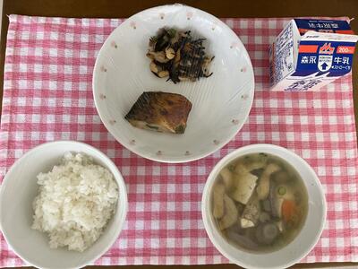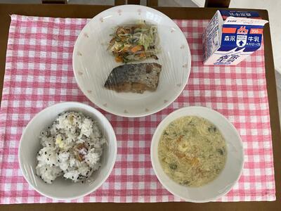 さつまいもごはん、鰆の照り焼き、あえもの、むらくもじる、牛乳