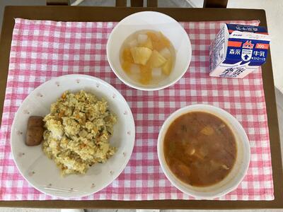 ツナいりカレーピラフ、ミネストローネ、フライドカンパン、フルーツポンチ、牛乳