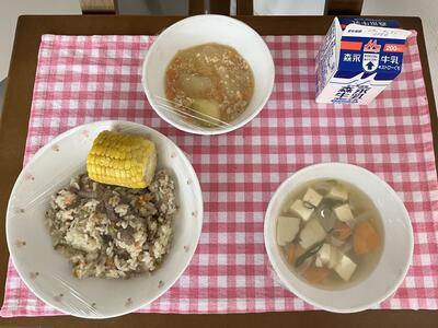ぎゅうめし、とうがんのそぼろあん、とうもろこしのしおゆで、とうふじる、牛乳