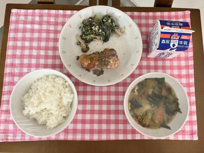 ごはん、さけのピリッとジャン、こまつなときのこのわふうサラダ、みそしる、牛乳