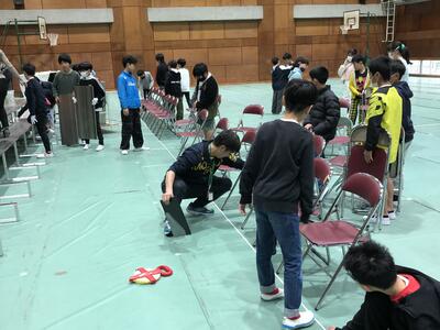 10日(水)の入学式にむけて6年生が体育館の準備を行いました。