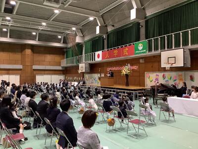 ドキドキのクラス分けの後、体育館で着任式が行われました。