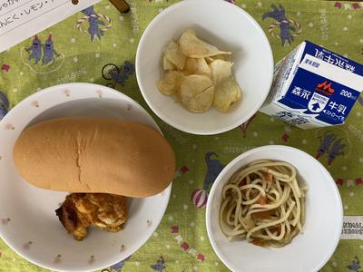 パン、冷製パスタ、タンドリーチキン、ポテトチップス、牛乳です。