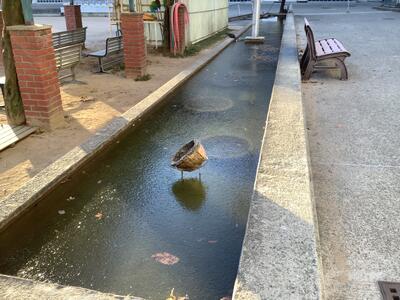 職員室前の「打出の水辺」に今年も氷がはりました。