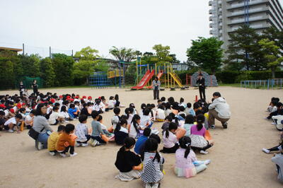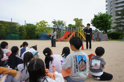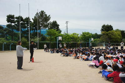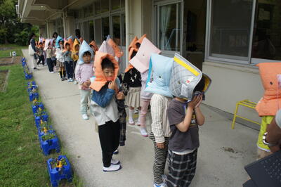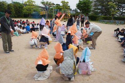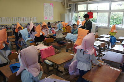 避難訓練 投稿: 編集者 (08:32) 避難訓練を実施しました。 教室で防災ずきんを被る練習をしました。 サイレンが鳴り、 火災(訓練)が起きた放送を聞くと すぐに避難をはじめました。 火元(訓練)から離れるために 運動場に避難しました。 校長先生のお話を聞きました。 お・は・し・も を守って避難することを学びました。